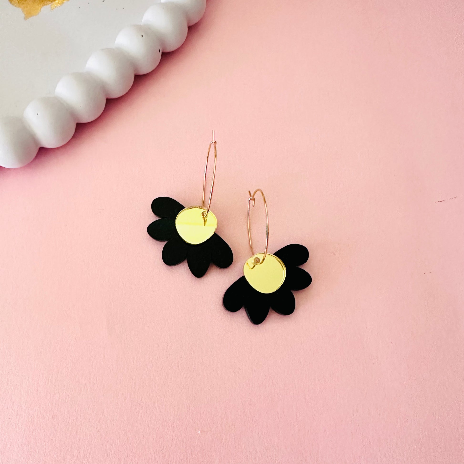 Featuring mirrored gold studs paired with layered black petal-like shapes, they’re perfect for lovers of bold, botanical-inspired designs.