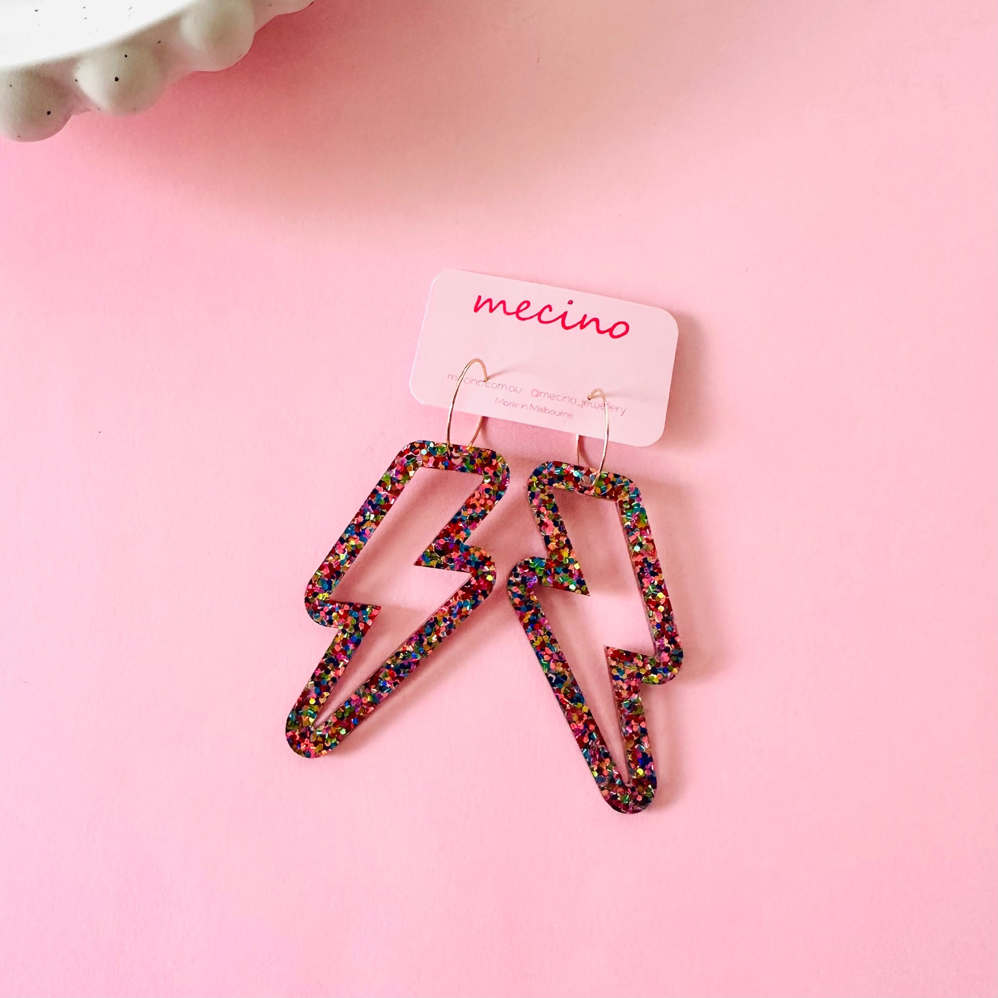 These earrings are bold, lightning bolt-shaped hoops made from a sparkling confetti acrylic finish.