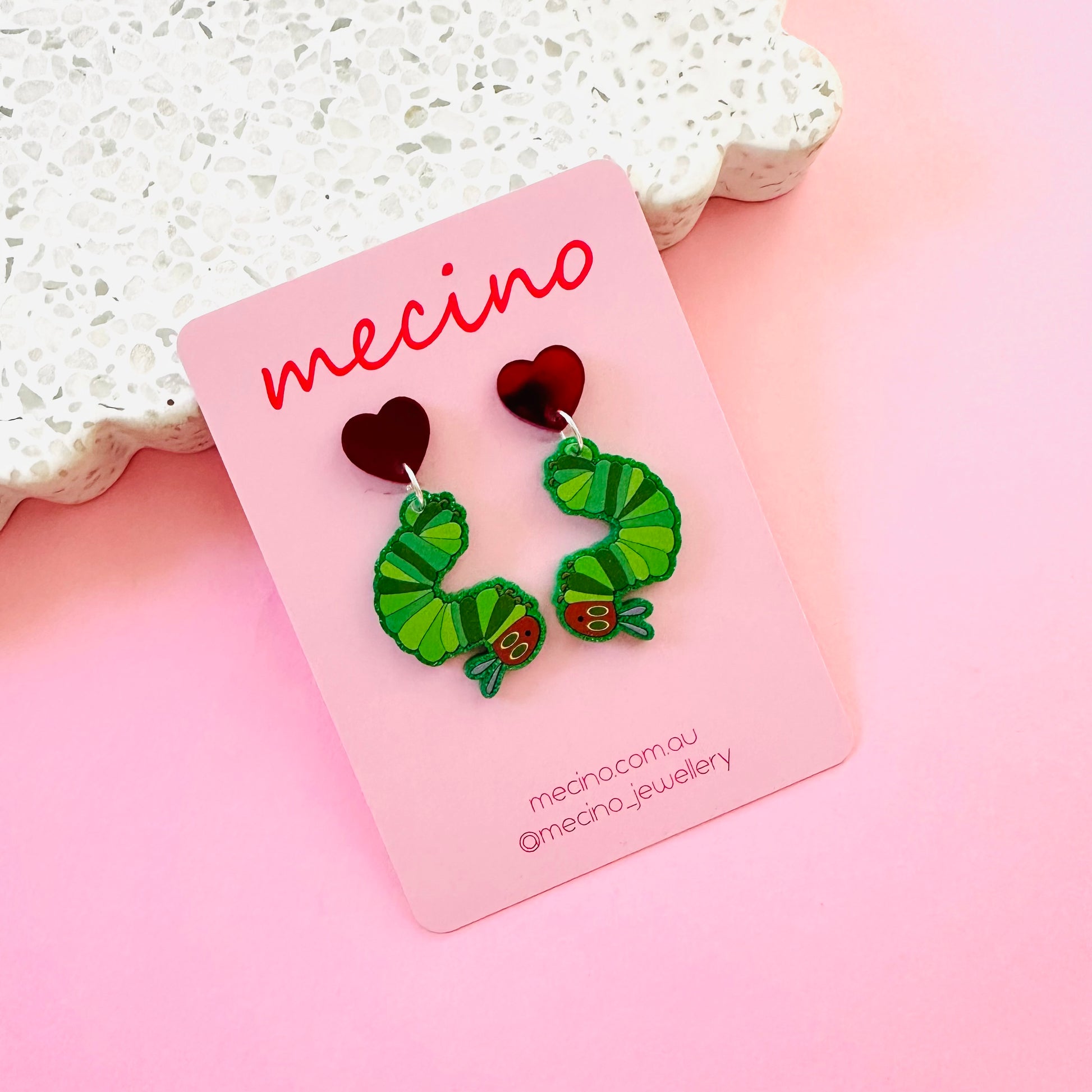 A medium sized earring easy to pop on, caterpillars measure 3.5cm. Mirrored red stud bases measure 15mm.