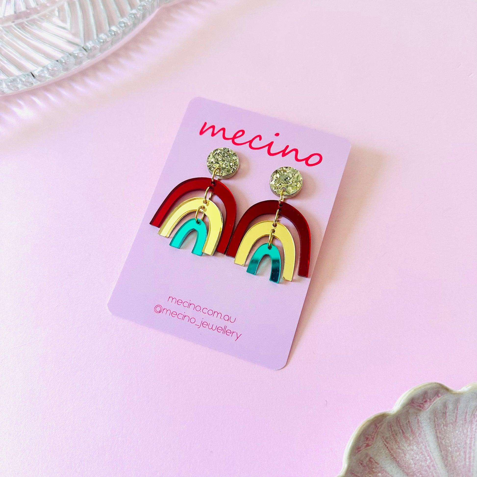 Festive, fun and full of colour 🌈✨ These Christmas Rainbow earrings add a sparkly pop to your holiday outfits. Super lightweight mirrored acrylic and guaranteed to spread a little Christmas cheer!