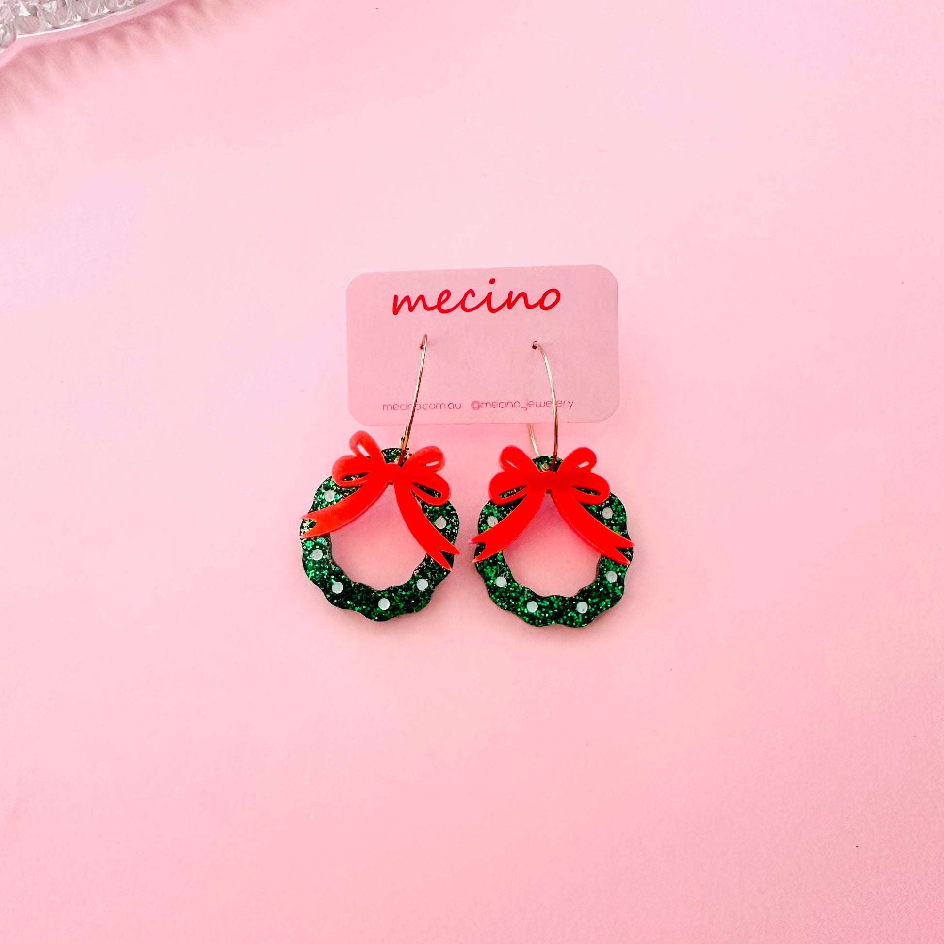 Celebrate the season with these playful Christmas wreath earrings. Sparkling hand painted green glitter wreaths are topped with bold red bows, bringing a festive pop of colour to any outfit.
