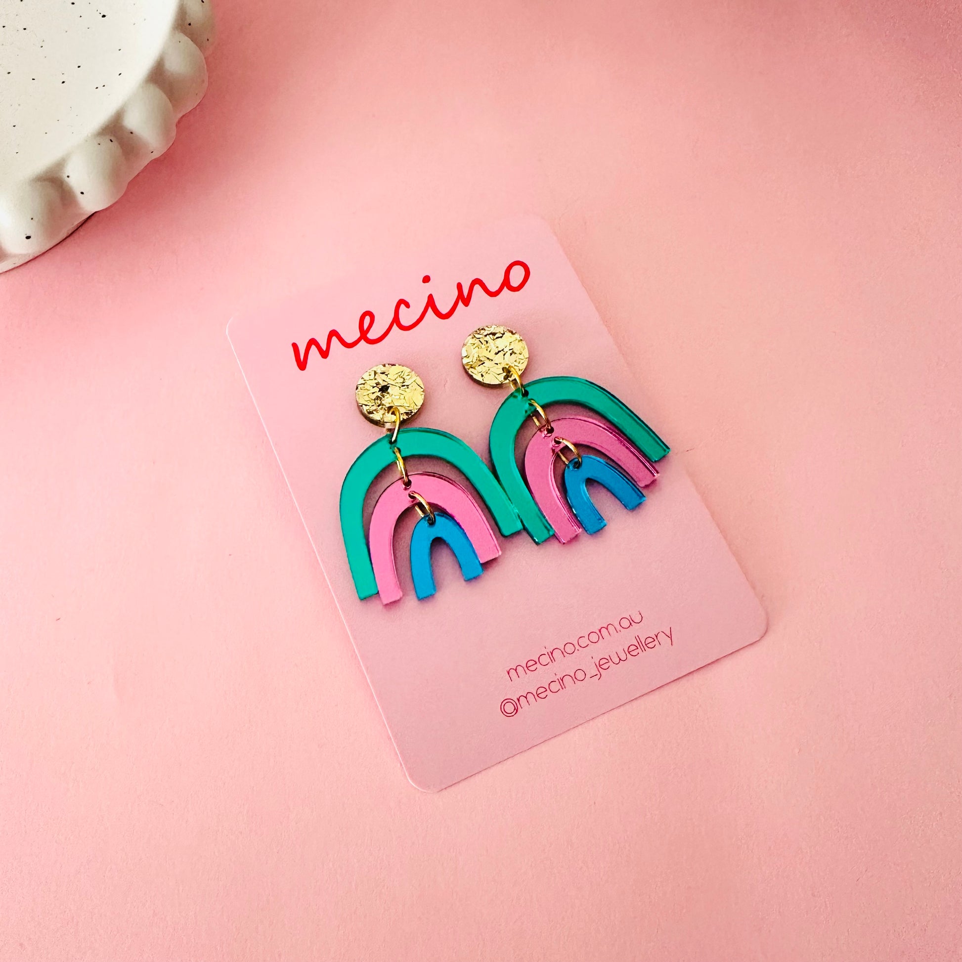 Featuring three layered arches in mirrored green, pink, and blue, each piece is accented with a textured gold-tone glitter stud for contrast.
