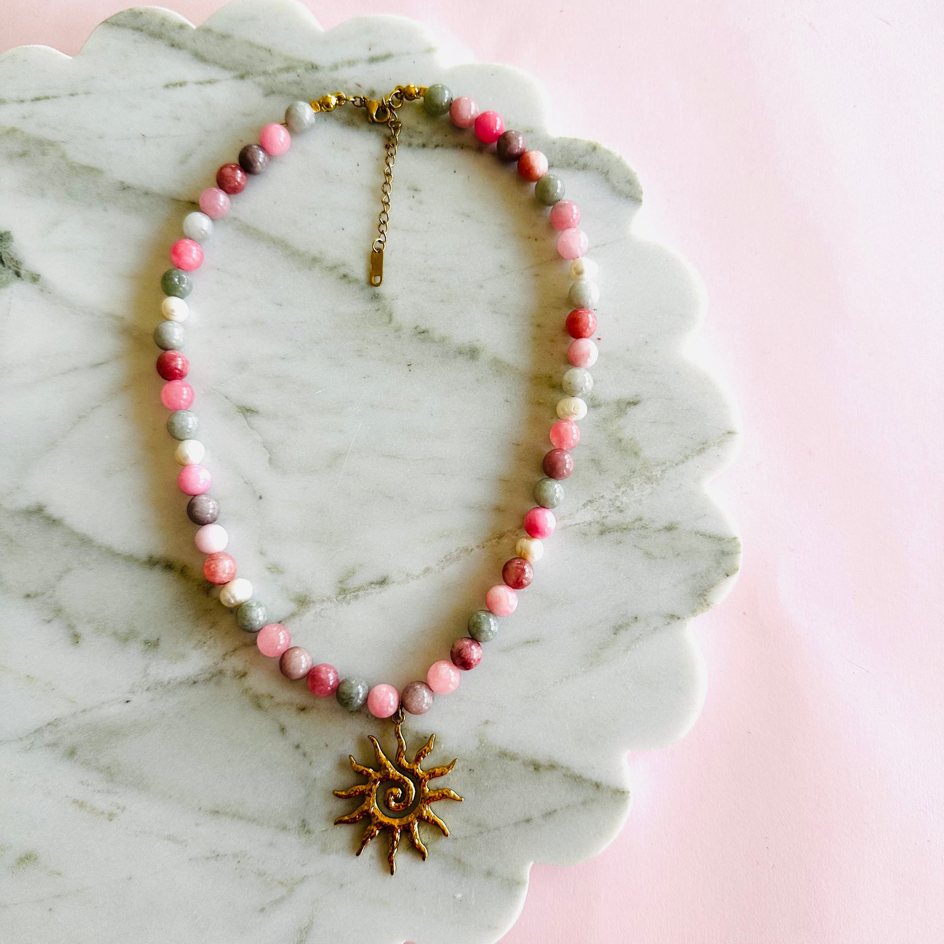 Soft pink, rose, and earthy green beads with a bold sun charm in the centre. Easygoing but eye-catching—perfect for everyday wear with a bit of warm, happy energy. Non-tarnish gold stainless steel sun charm and hardware.