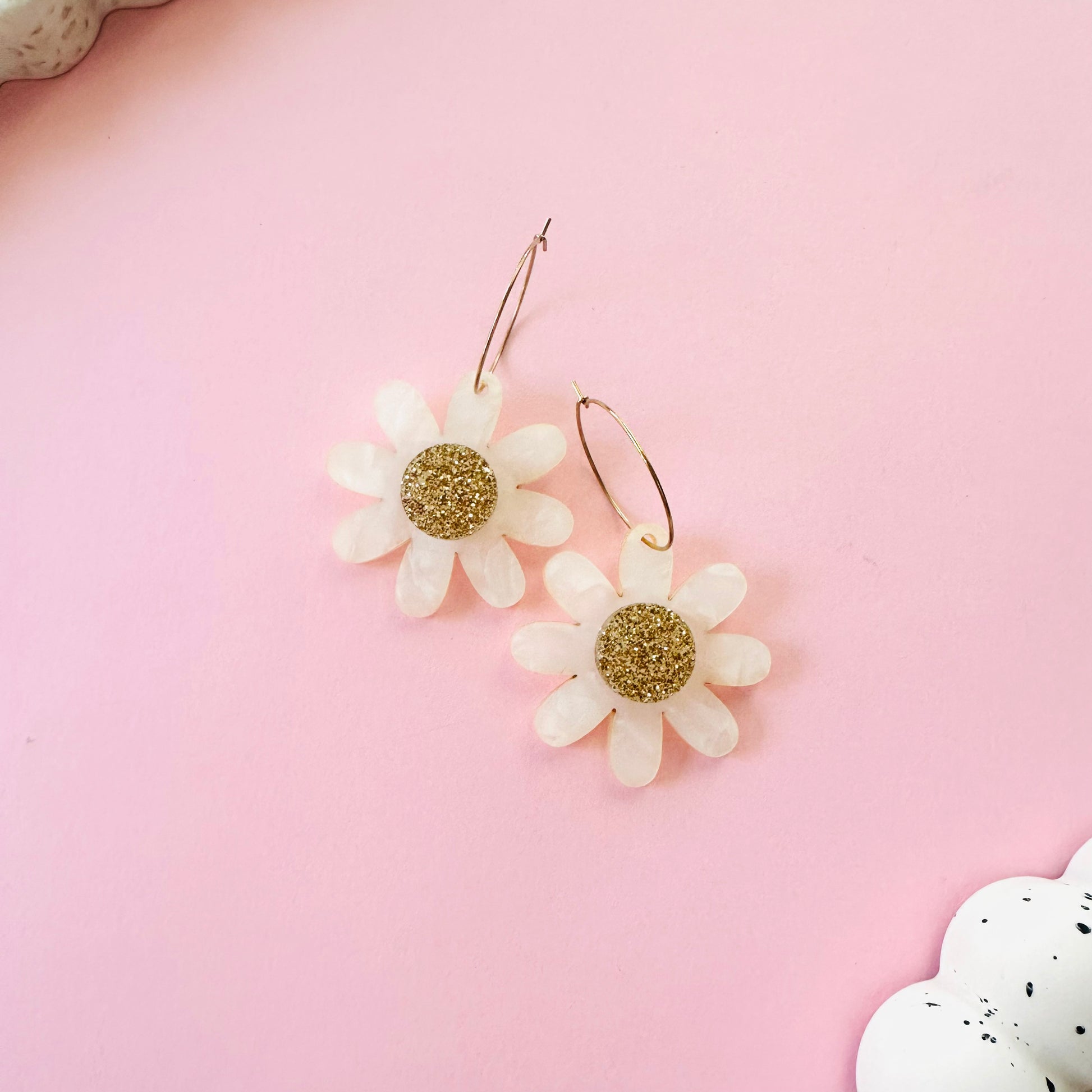 The petals are a soft, pearly beige, and the centre of each flower has a sparkly gold circle. They hang from simple gold hoops, giving off a fresh and casual vibe—perfect for adding a little playful touch to any outfit.