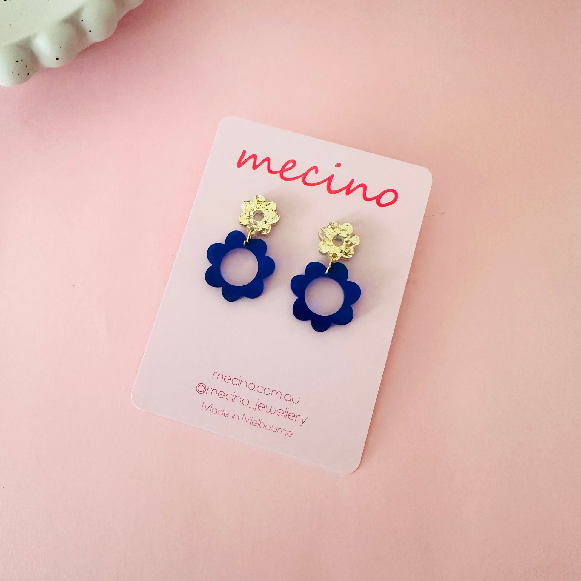 Double flower drops in sparkly gold and frosted blue acrylic.