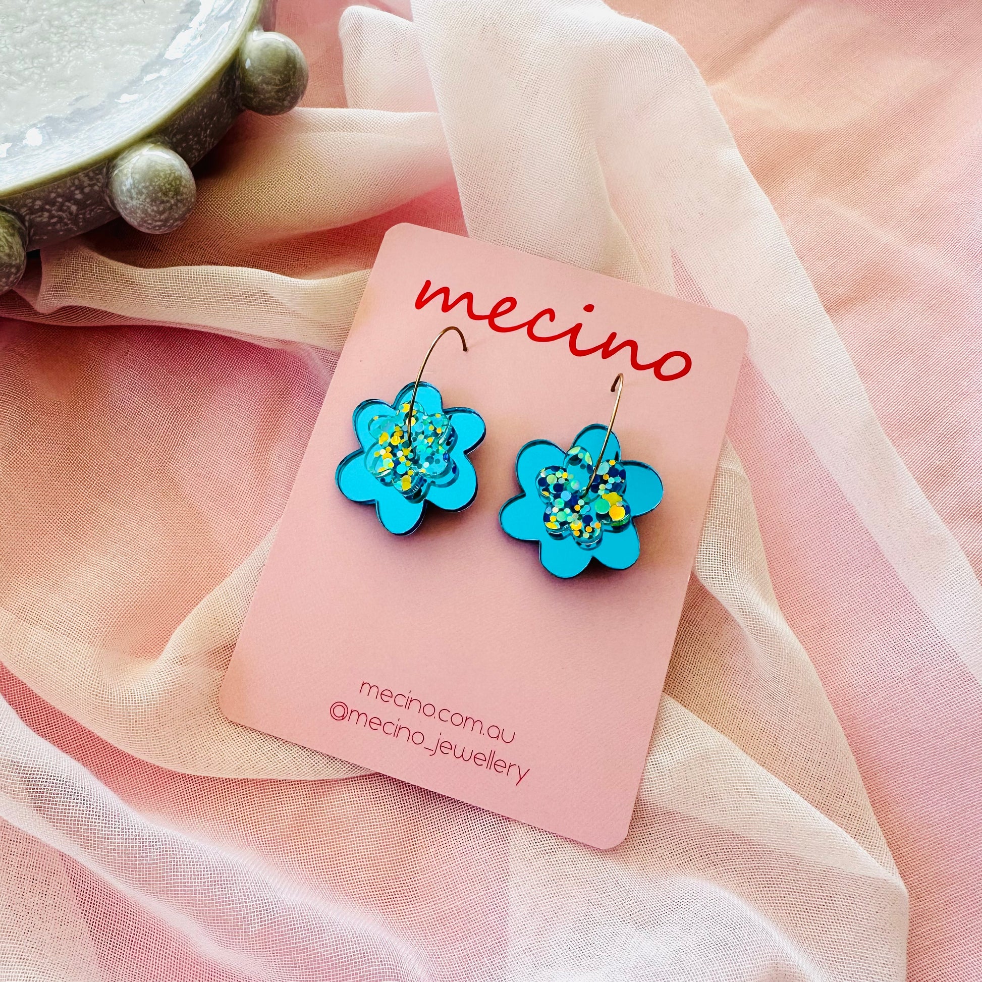 Made from lightweight acrylic, they feature a cute flower shape with colourful confetti in the centre that catches the light just right.