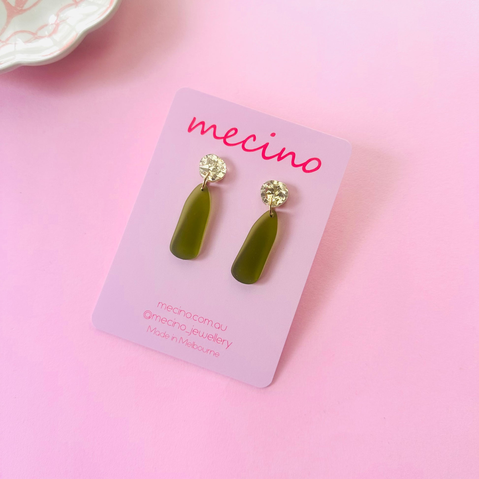 Frosted green drops and sparkly gold studs.