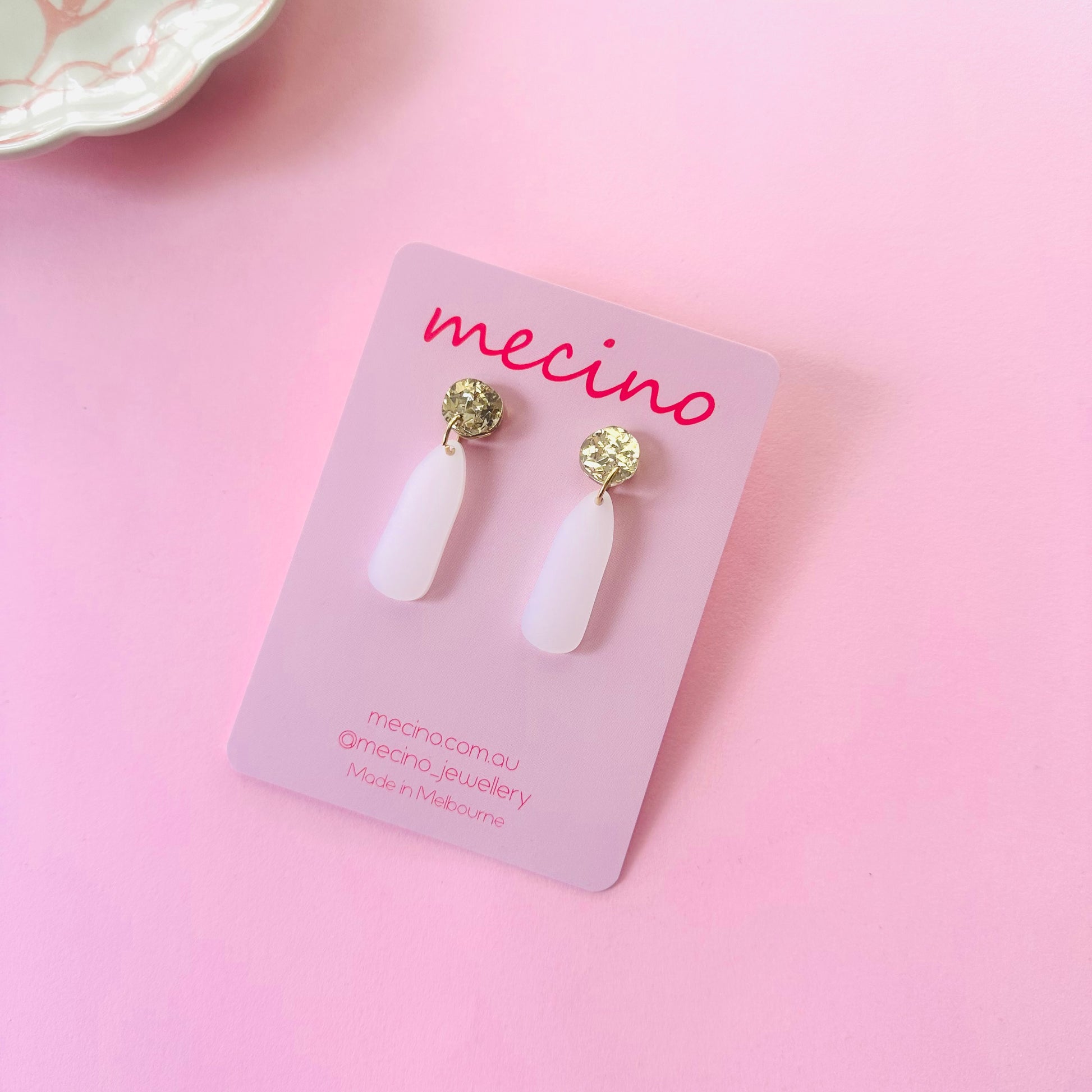 Frosted white drops and sparkly gold studs.