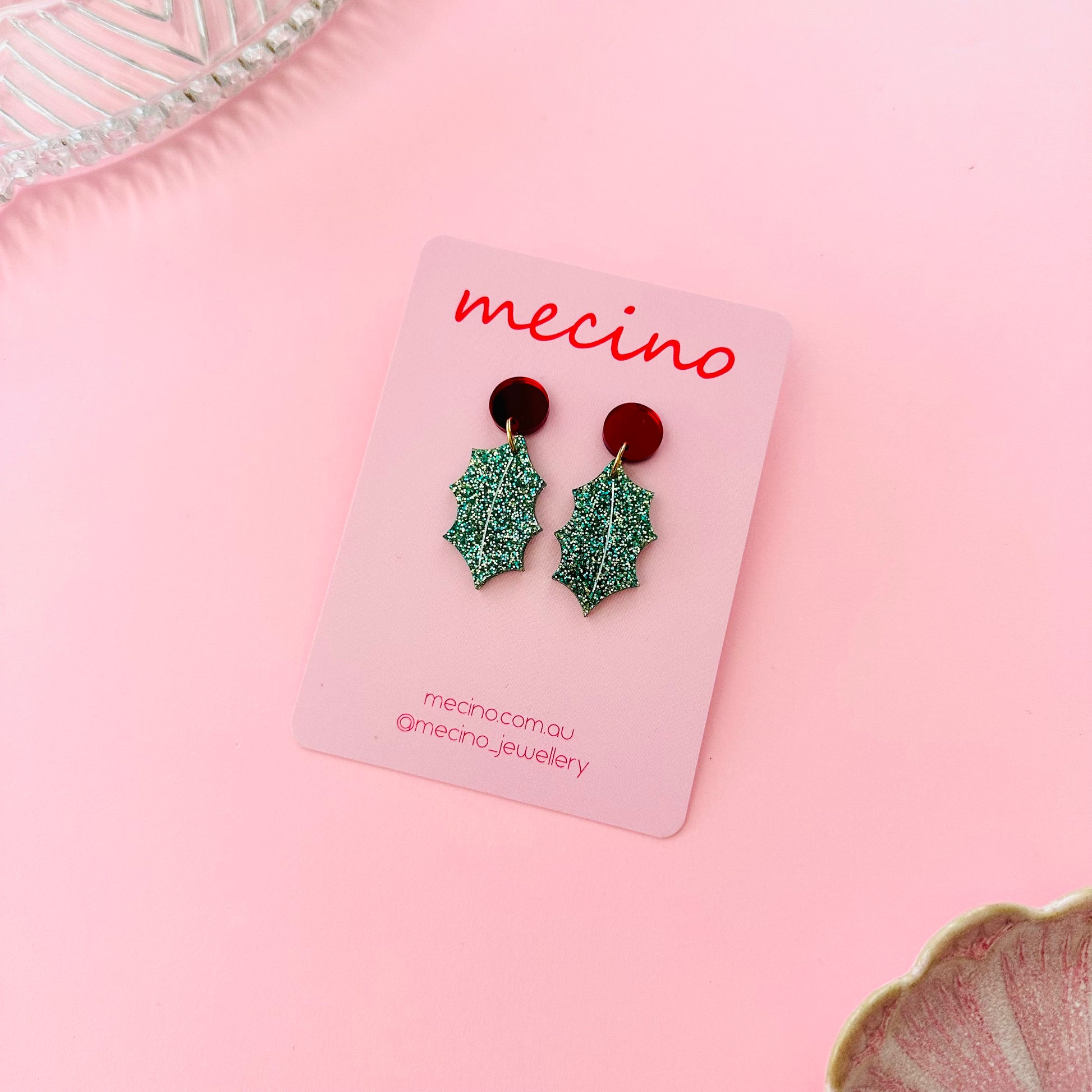 These glittery holly leaves with a mirrored red stud are the easiest way to add some festive fun to your outfit. Light, comfy, and super Christmassy!