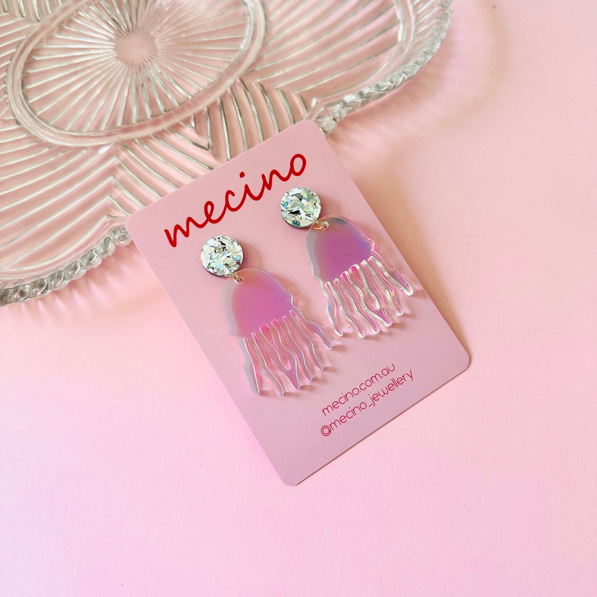 Iridescent jelly fish measure 30 mm wide and 45mm in length, sparkly silver studs measure 15mm.