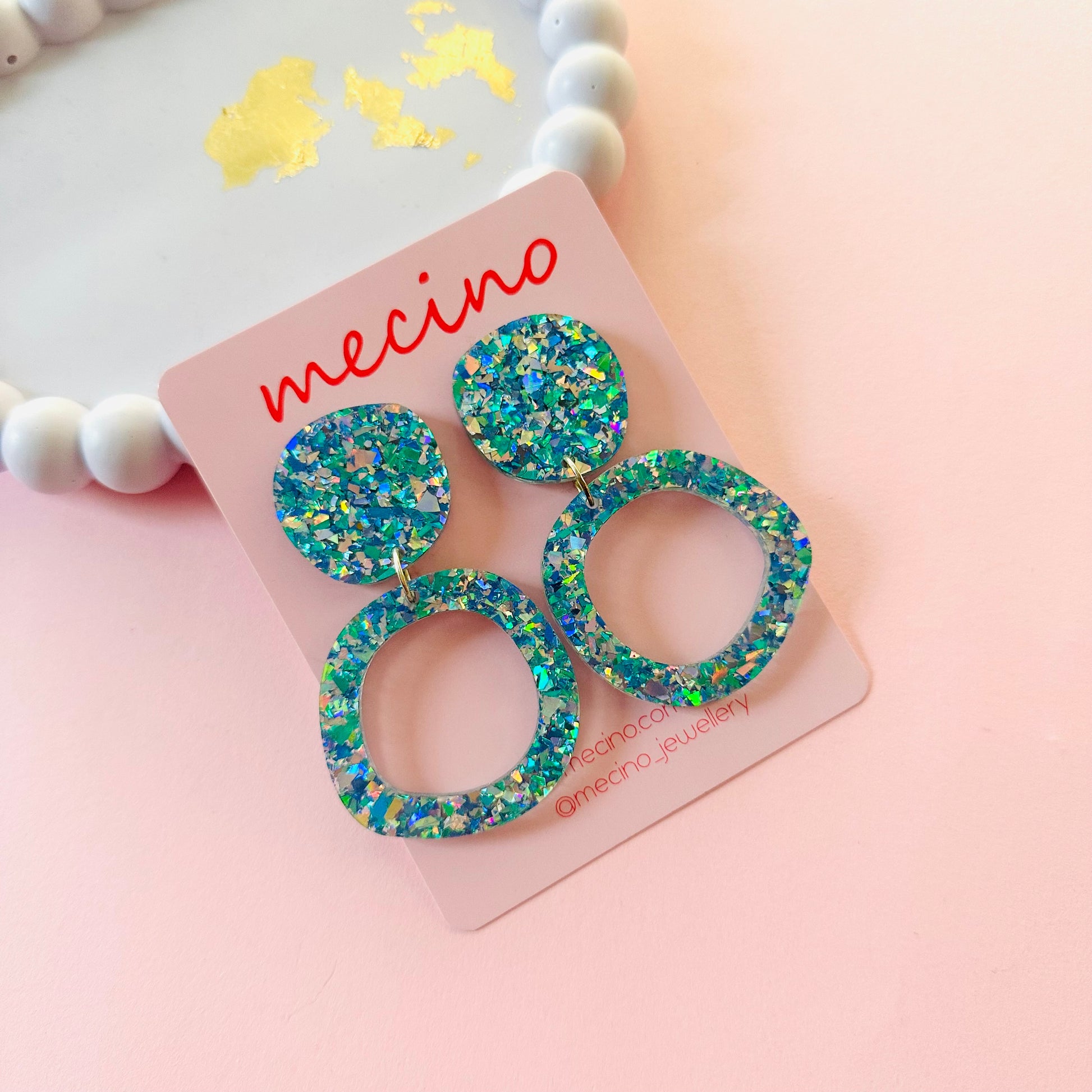 These casual earrings feature two linked pieces: a small rounded square stud and a larger open circle, both in sparkly blue glitter with a holographic shine. They add a playful yet stylish touch to any everyday outfit.