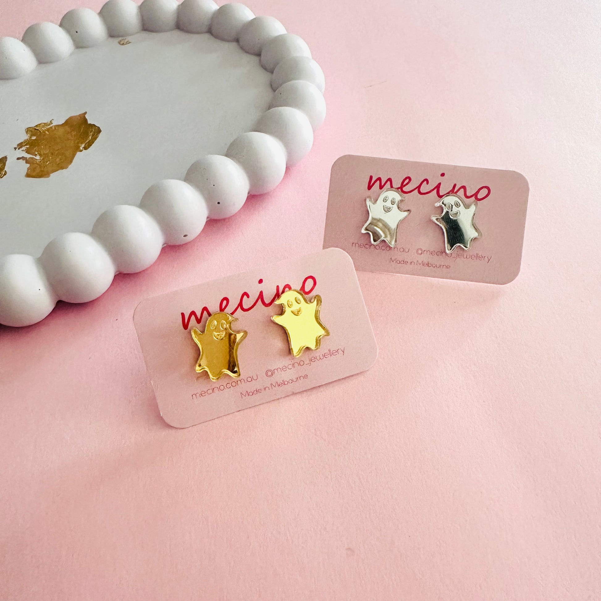 Playful, spooky-cute studs made from mirrored acrylic in gold and silver. Lightweight, shiny, and perfect for adding a little fun to any outfit.