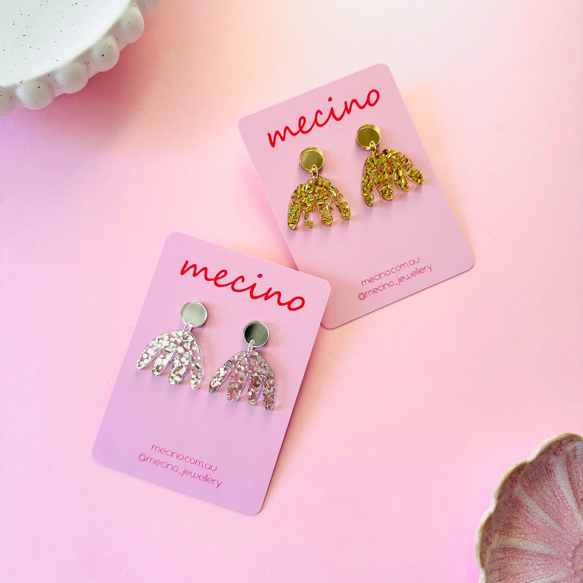 Add some sparkle and sass with these glittery acrylic earrings in silver and gold!