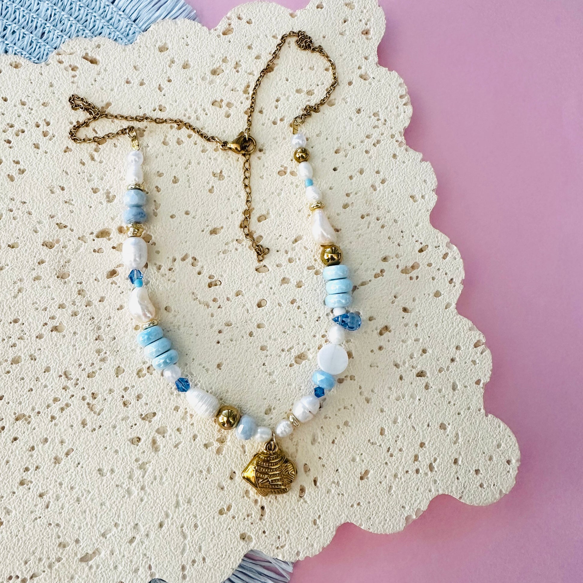 Soft blues, freshwater pearls, Swarovski crystals and golden stainless steel beads and fish charm come together in this dreamy seaside piece. Effortlessly coastal and beautifully calming — it’s the perfect touch of beachside elegance for everyday wear.