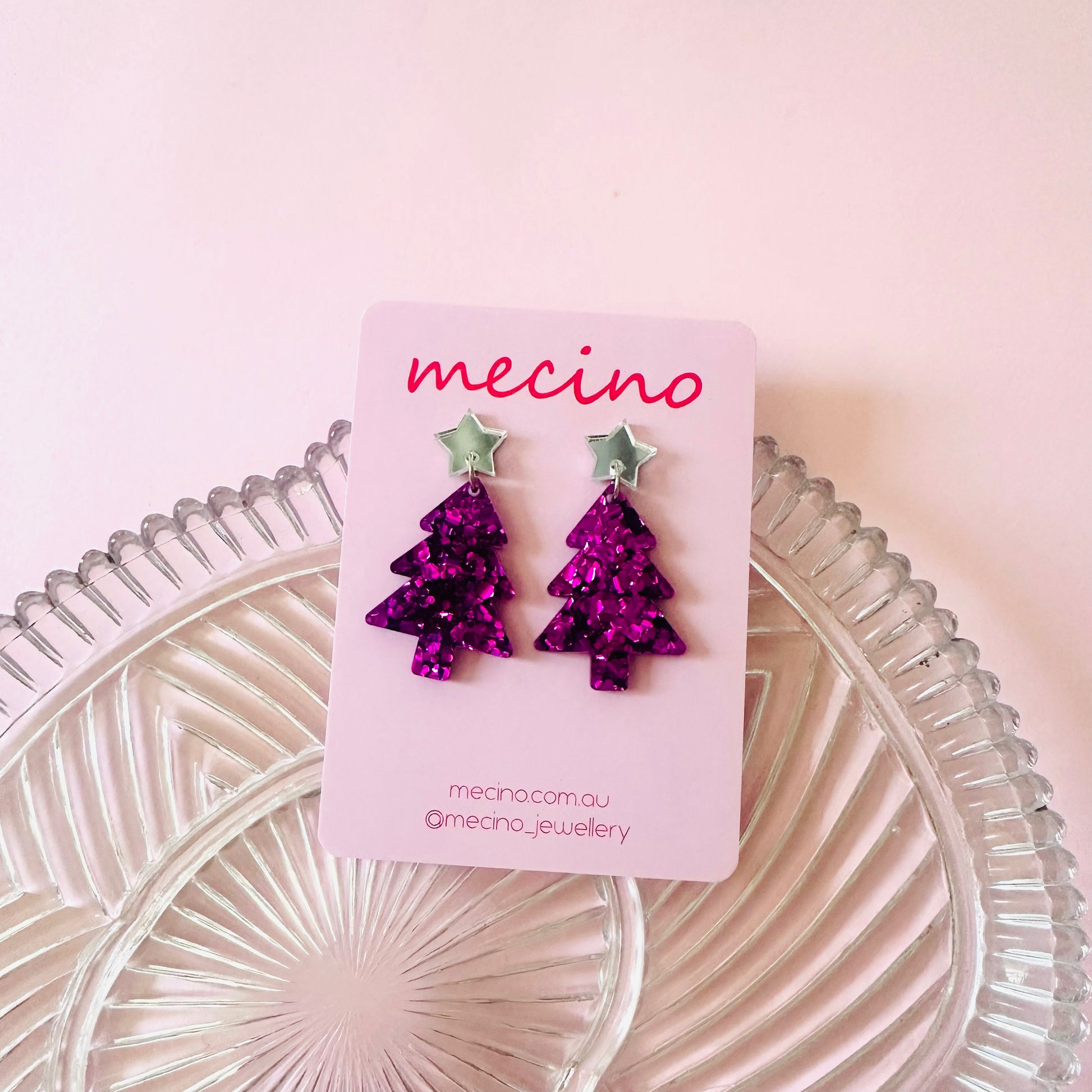 Shiny little Christmas trees with a mirrored silver star on top – sprinkled with glitter for extra festive sparkle. Light, fun, and perfect for adding a pop of Christmas cheer to your outfit.