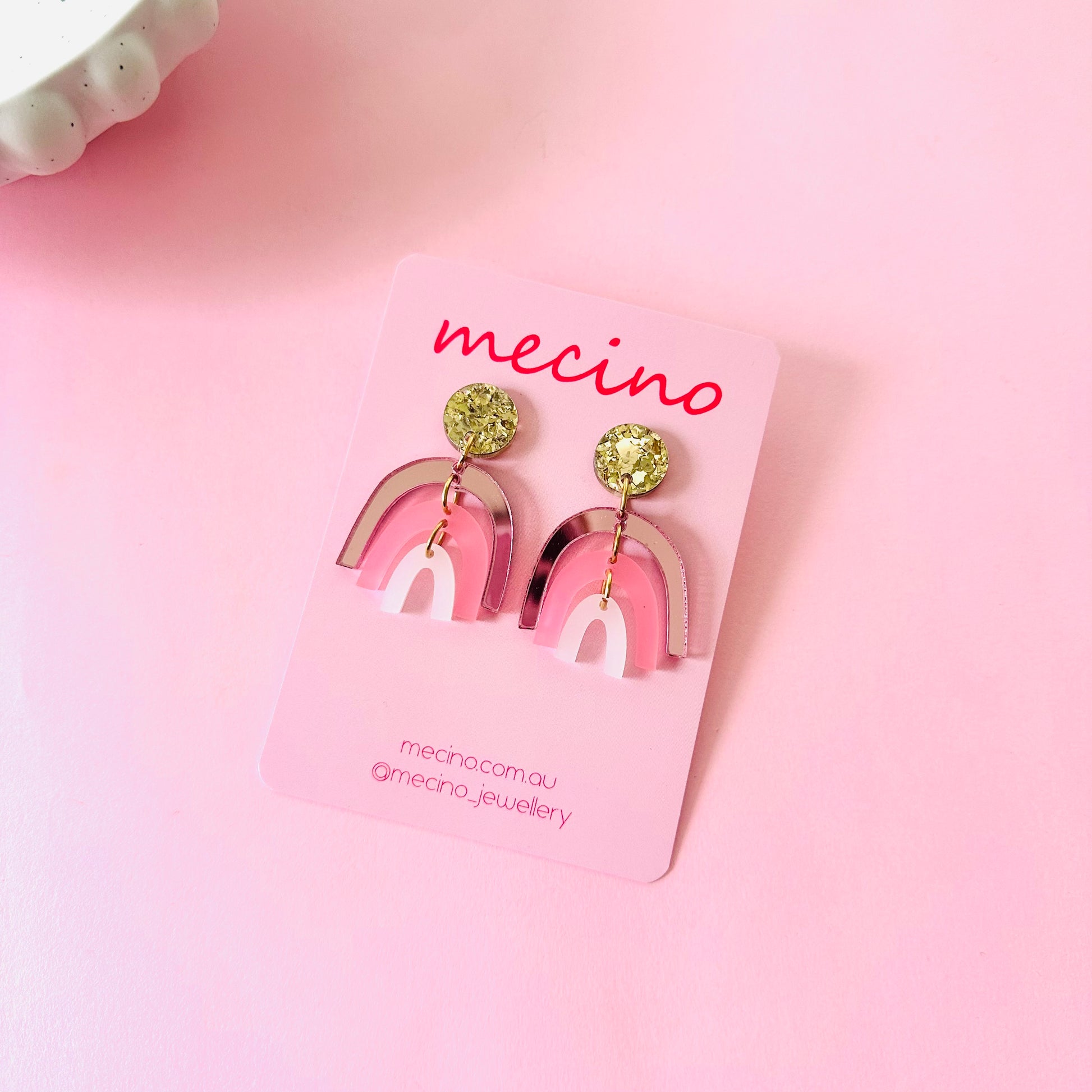 They feature soft pink, white, and mirrored pink rainbows hanging from sparkly gold studs. Super lightweight and easy to wear, they’re perfect for adding a little extra cheer to any outfit.
