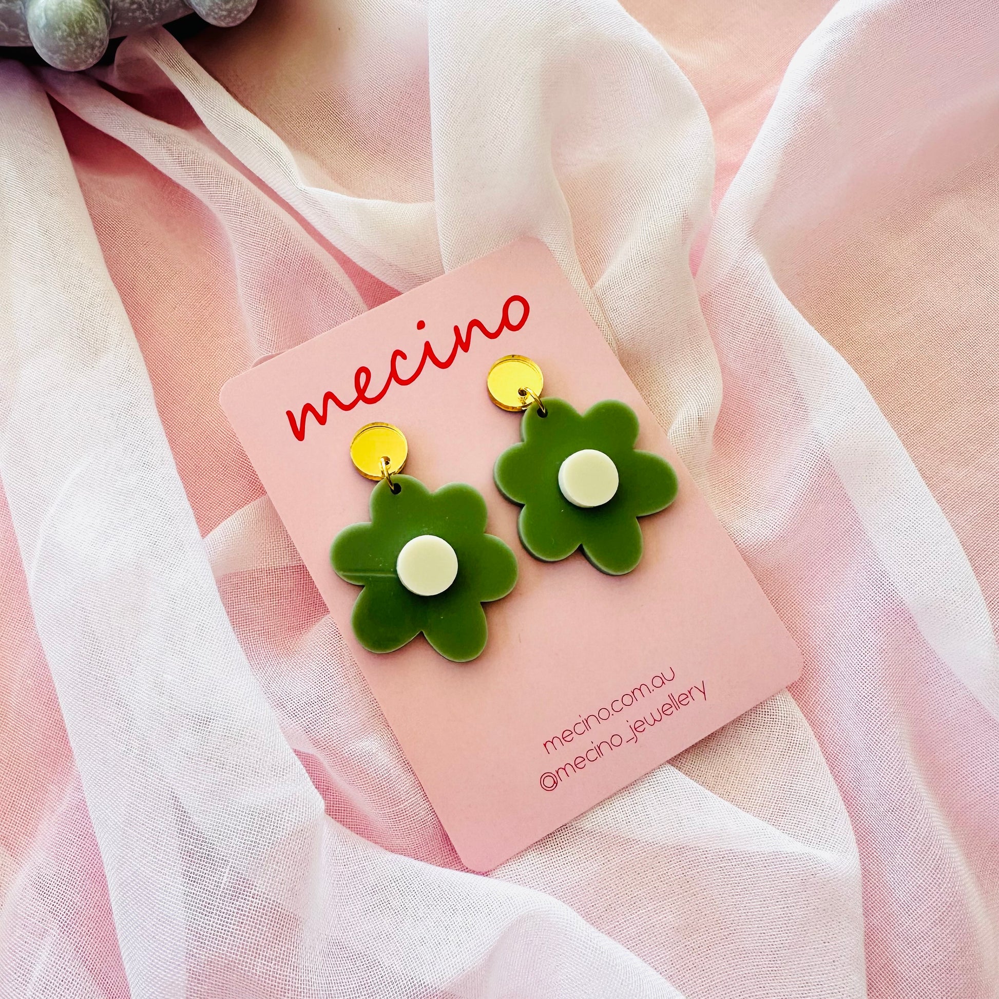 Crafted from lightweight acrylic, these earrings feature a sage green flower with a contrasting cream centre, hanging from a mirrored gold stud. Perfect for brightening up any casual outfit or adding a whimsical touch to your summer style.