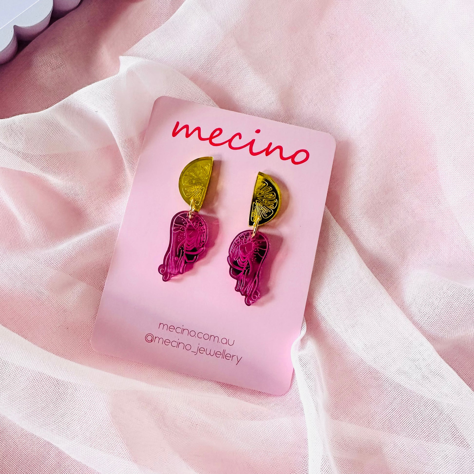 Mirrored yellow lemon slices and mirrored pink prawns. Prawns measure 2.5cm in length.