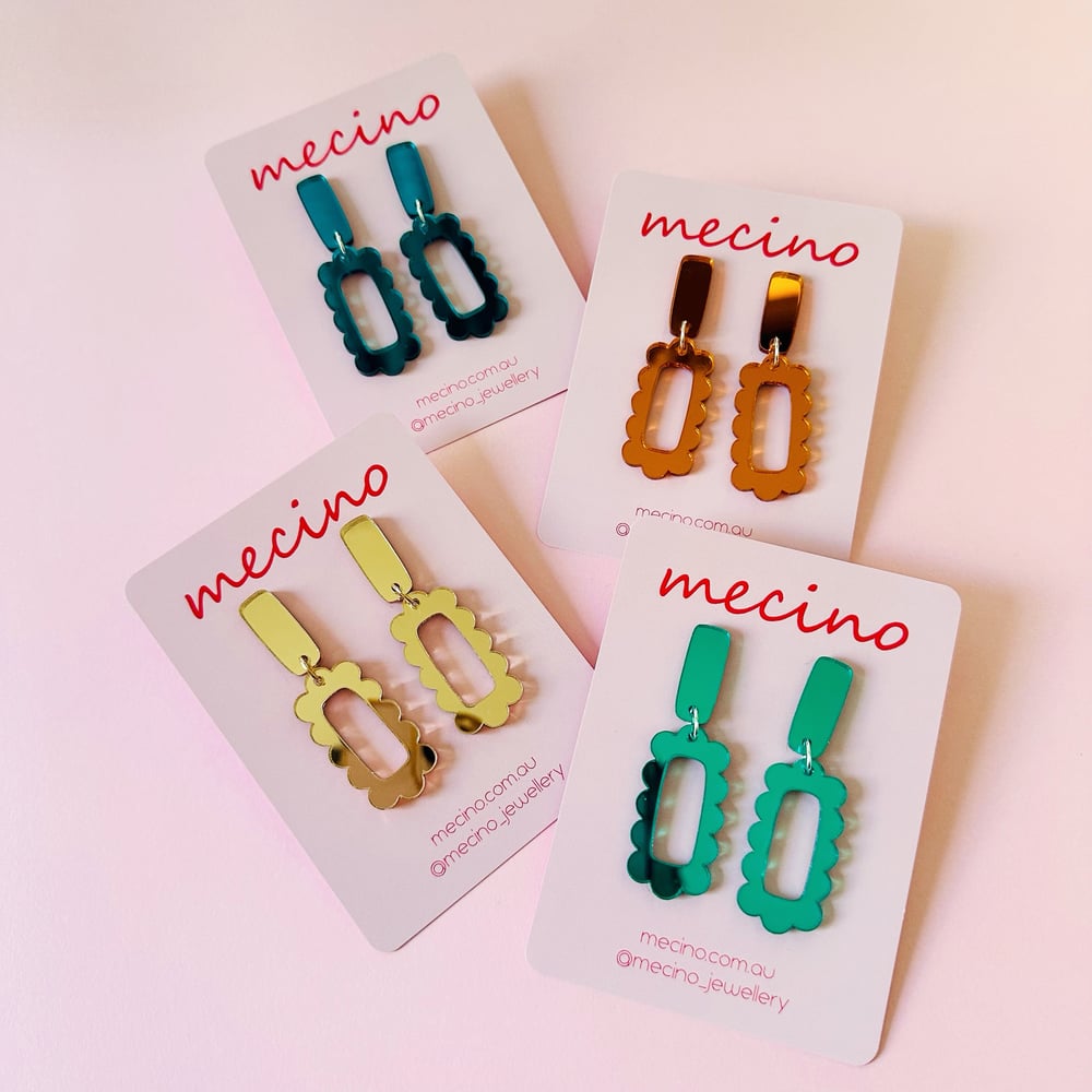 These chic acrylic earrings feature a playful scalloped drop design, available in a range of vibrant mirrored acrylic colours.