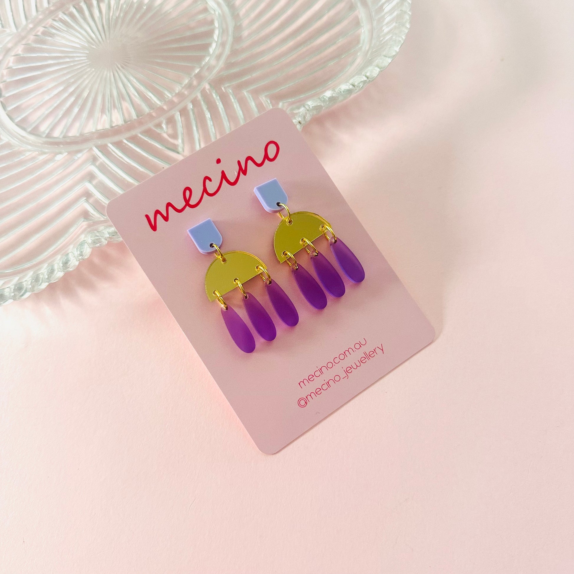 Violet stud bases, mirrored gold center and frosted purple tear drops.