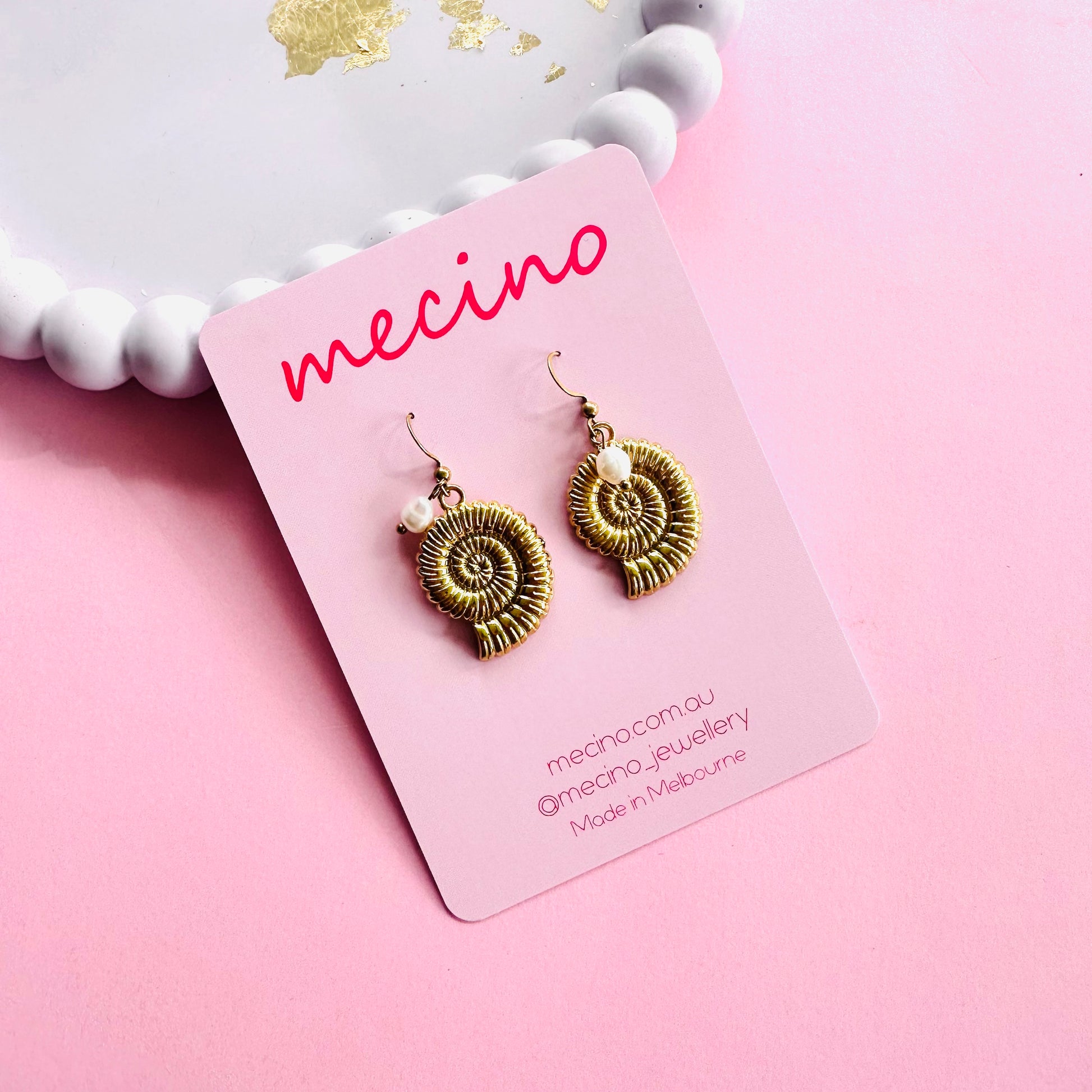 These earrings feature gold-plated stainless steel hooks with detailed spiral stainless steel shell charms and a dainty freshwater pearl. Lightweight, playful, and perfect for summer.