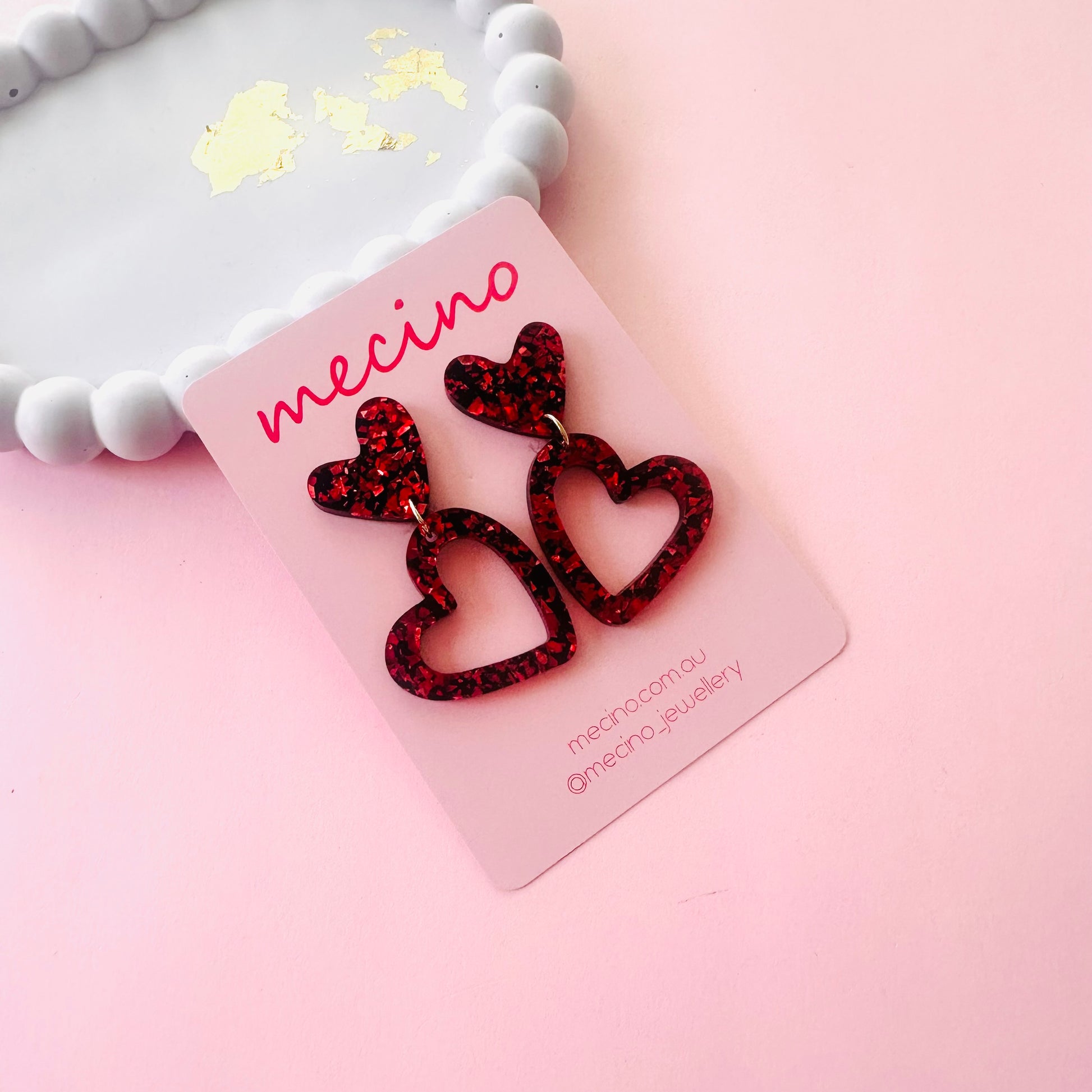 Stud hearts measure 25mm tall x 23mm wide. Heart cut out dangles measure 37mm tall x 35mm wide.