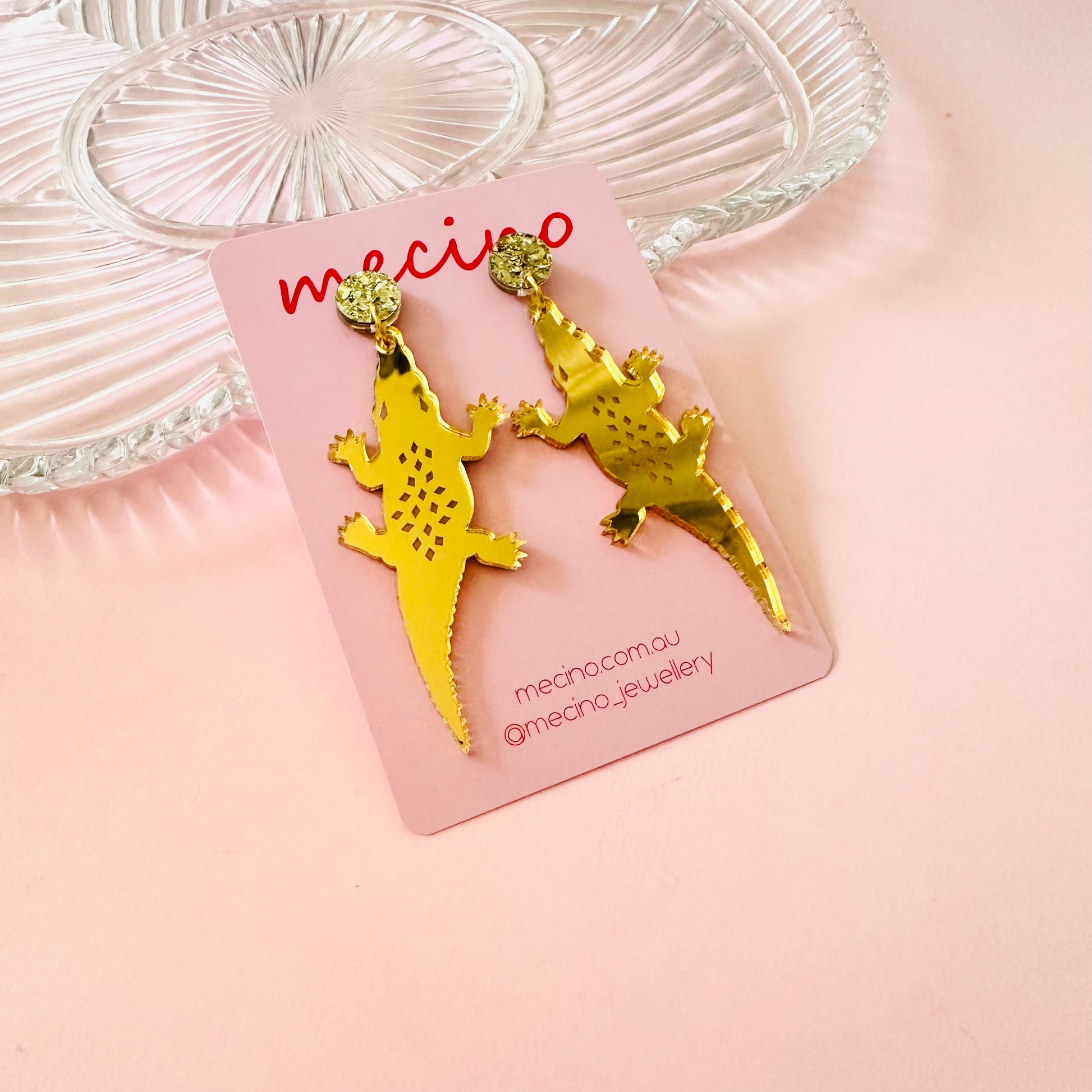 Alligators measure 75mm tall. Earring stud bases measure 12mm.