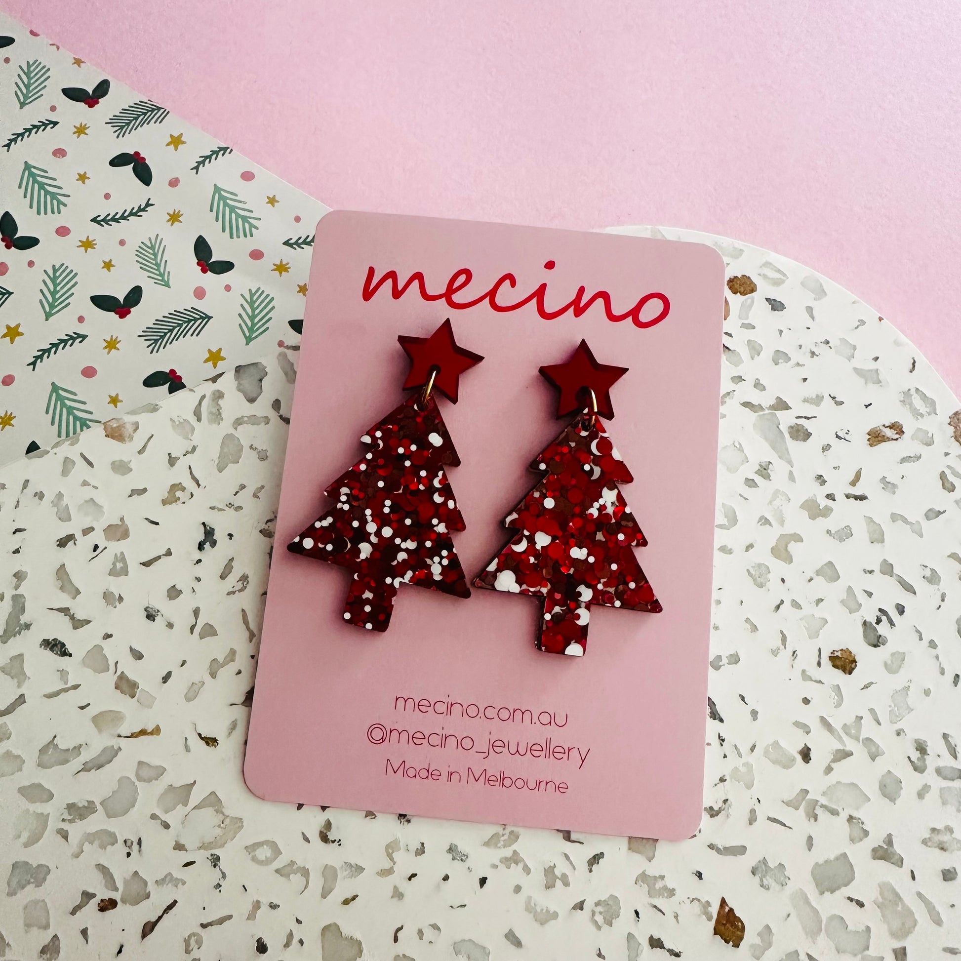 Shiny Christmas trees with a mirrored red star on top – sprinkled with glitter for extra festive sparkle. Light, fun, and perfect for adding a pop of Christmas cheer to your outfit.