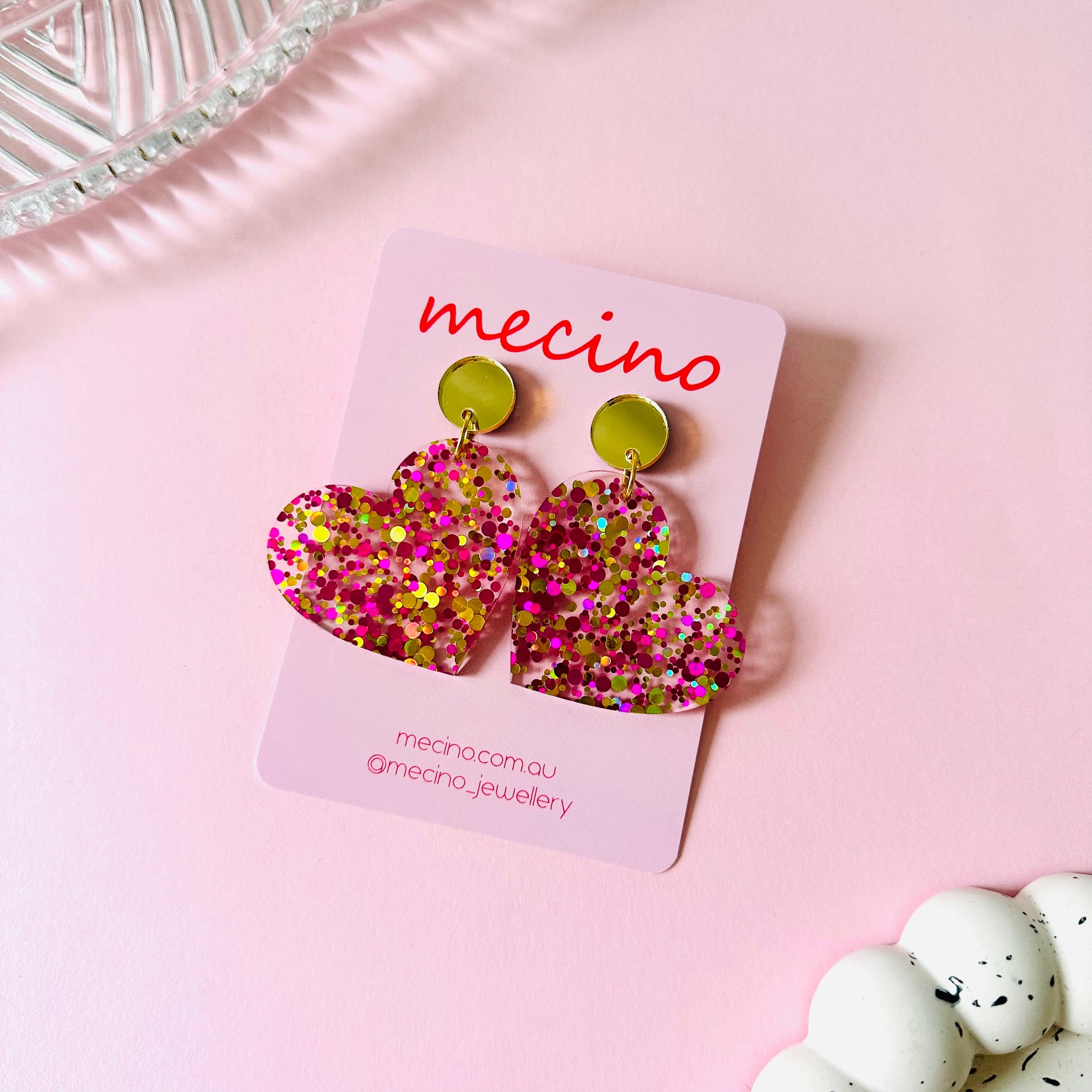 Bright pinks and golds sparkle inside clear hearts, hanging from mirrored gold studs.