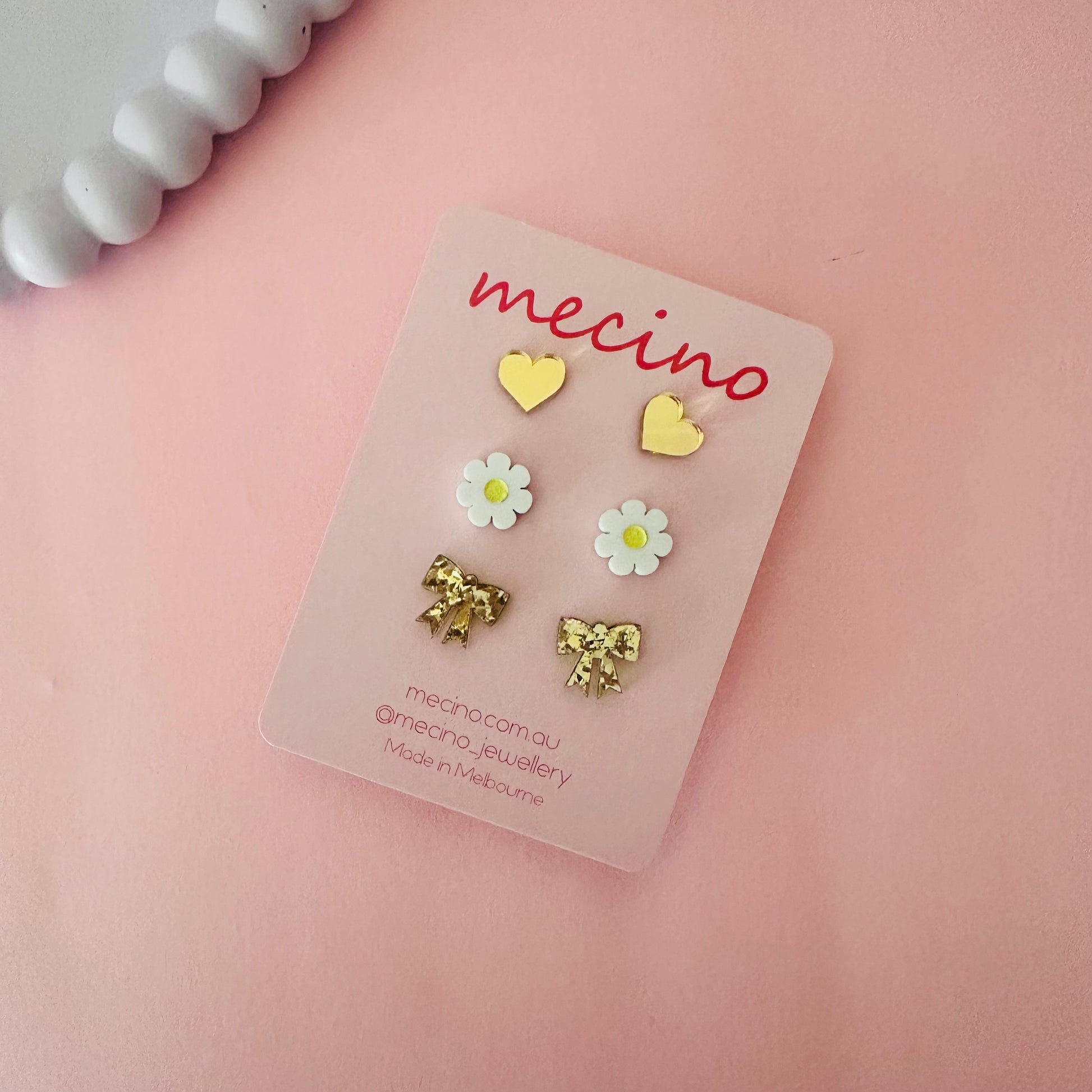 Mirrored gold heart studs measuring 12mm, hand painted flower studs measuring 15mm and sparkly gold bow studs measuring 25mm.