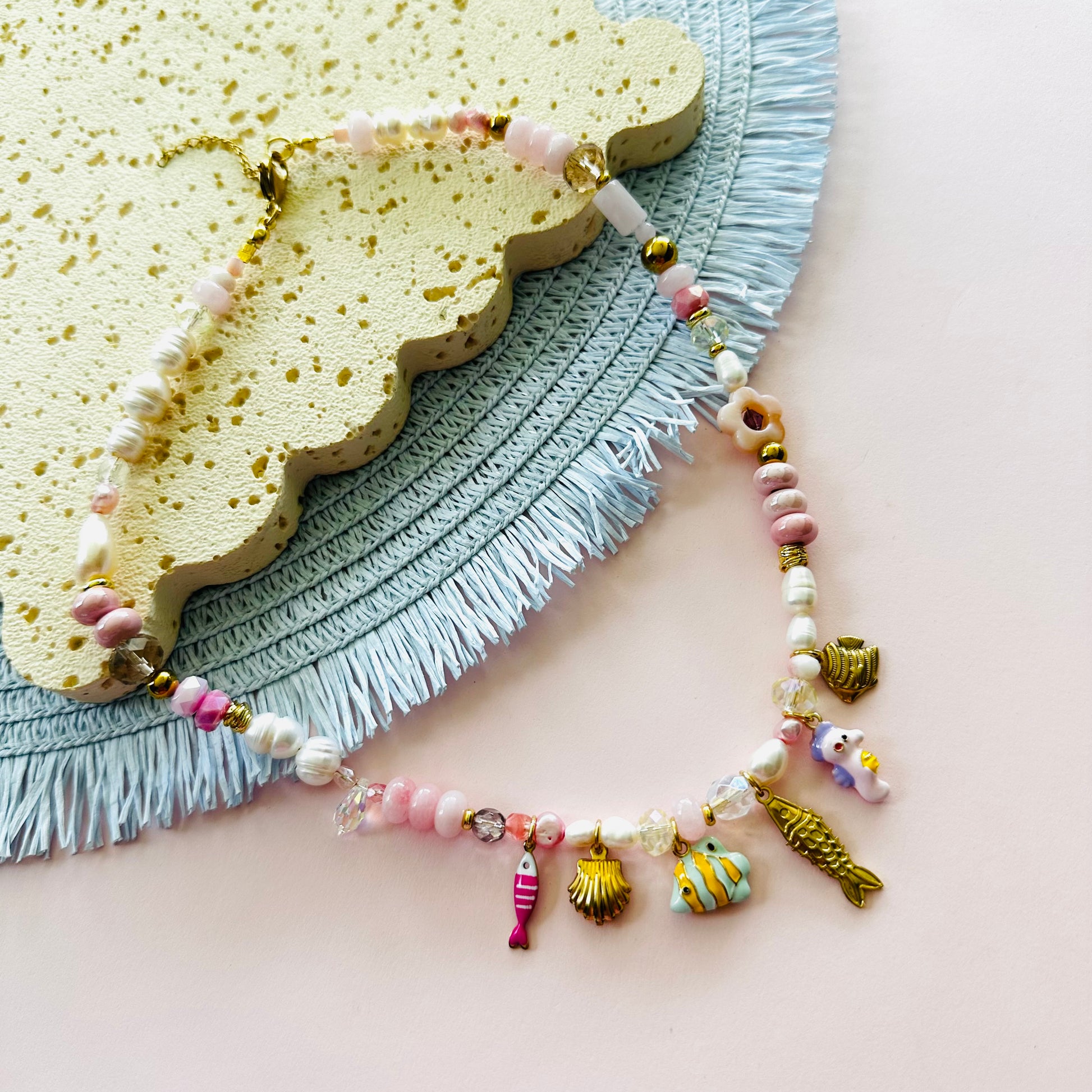 A seaside dream come true — pastel pinks, freshwater pearls, crystals, and a sprinkle of gold, finished with cute ocean charms including a fish, shell, and adorable seahorse. The Under the Sea Necklace brings all the sunny, salt air vibes in one sparkly little piece.